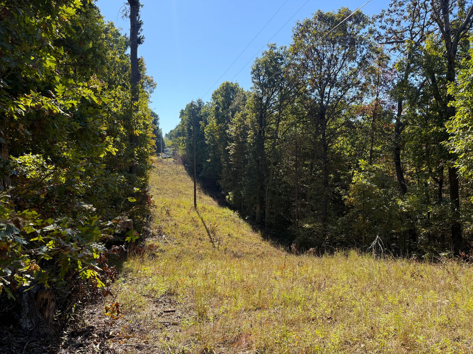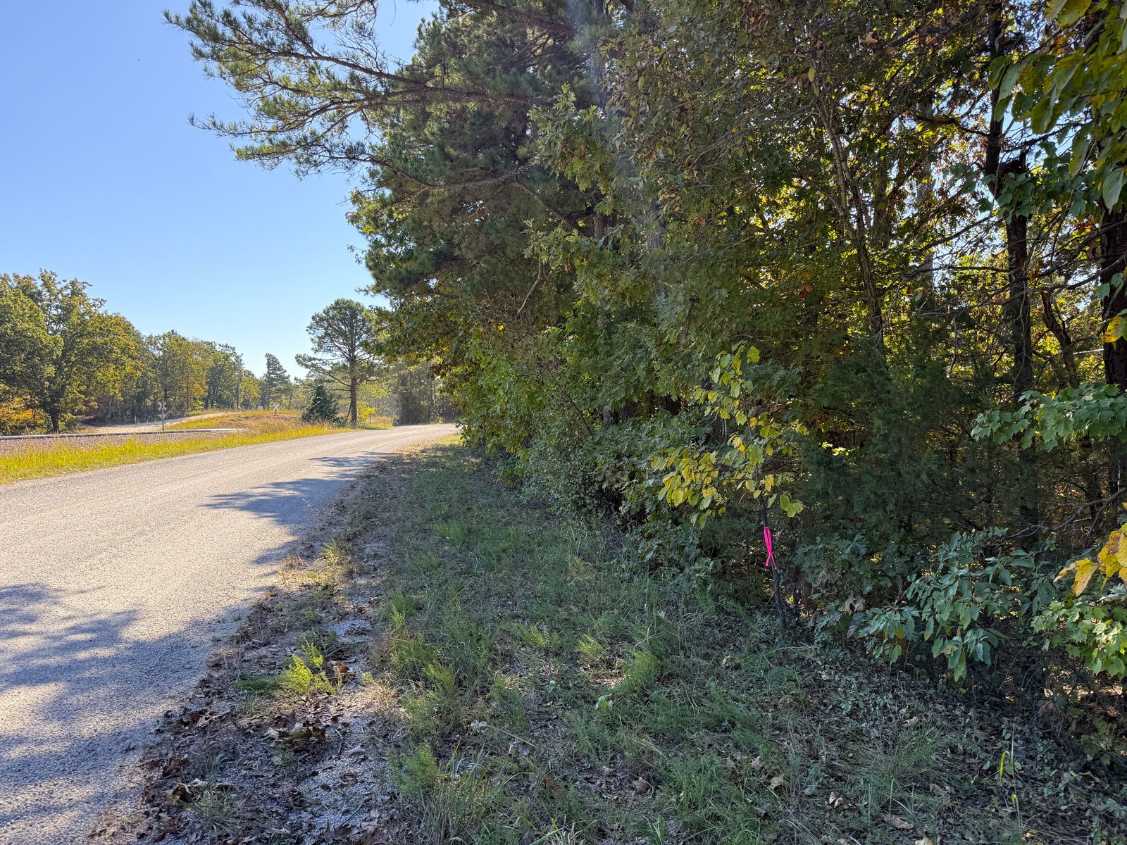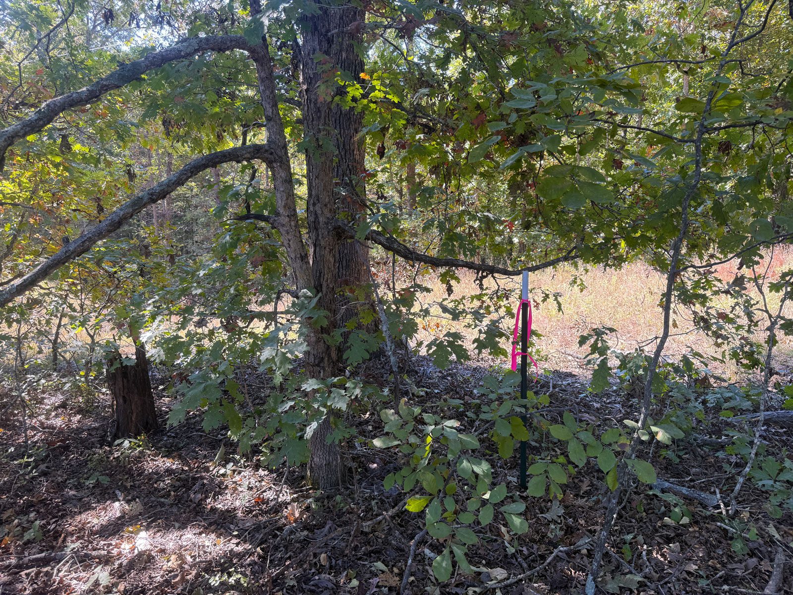 The Willow Springs Railroad Property is 1.98 fully-surveyed acres of dense, mature woods that sit just off County Road 3820 in Howell County, Missouri. Much of the county road is gravel, but, as luck would have it, the section along the parcel is paved from where it crosses a set of railroad tracks to the southeast, all the way to State Highway 60/63, a little over a quarter mile northwest. This paved section includes all 314.45 feet of frontage that make up the parcel's eastern boundary. The highest elevations are around 1,490 feet on the northeast and southeast sides of the property (the corners that front the road). From there, it slopes down to a valley near the center of the property, where the elevation is about 1,470 feet.